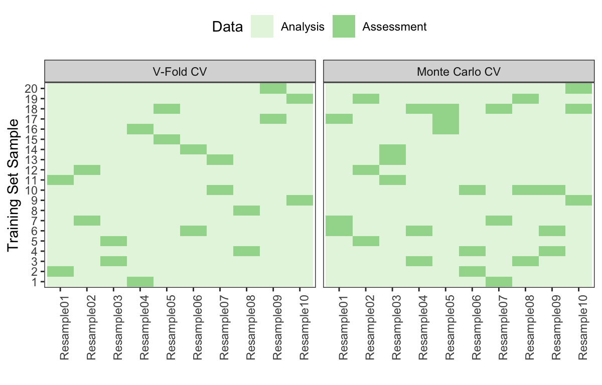 Figure 3.6 shows a diagram of 10-fold cross-validation for a hypothetical data set with 20 training set samples. For each resample, two different training set data points are held out for the assessment set. Note that the assessment sets are mutually exclusive and contain different instances.