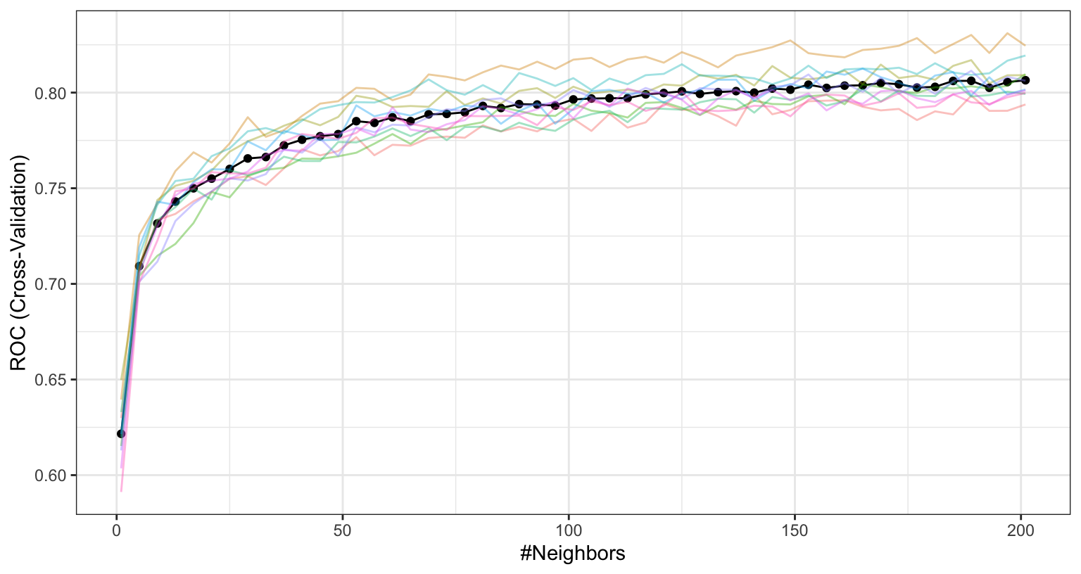 We will predefine the candidate set to be \(K = 1, 3, \ldots 201\)14. When combined with the same 10-fold cross-validation process, a total of 380 temporary models will be used to determine a good value of \(K\). Once the best value of K is chosen, one final model is created using the optimal number of neighbors. The resampling profile is shown in Figure 3.11. Each black point shown in this graph is the average of performance for ten different models estimated using a distinct 90% of the training set. The configuration with the largest area under the ROC curve used 201 neighbors with a corresponding AUC of 0.806. Figure 3.11 shows the individual resampling profiles for each of the ten resamples. The reduced amount of variation in these data is mostly due to the size of the training set15.