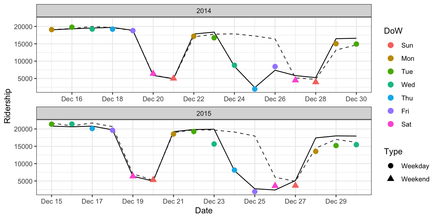 For example, for the Chicago train data, some days had their ridership numbers drastically over-predicted. The reason for the overprediction can be determined by investigating the training data. The root of the problem is due to holidays and ancillary trends that need to be addressed in the predictors (e.g., “Christmas on a Friday” and so on)20. For a support vector machine, the impact of these new features are shown in Figure 3.12. The panels show the assessment set predictions for the two years that were resampled. The dashed line shows the predictions prior to adding holiday predictors and the solid line corresponds to the model after these features have been added. Clearly these predictors helped improve performance during these time slices. This had an obvious commonsense justification but the assessment sets were evaluated to confirm the results.