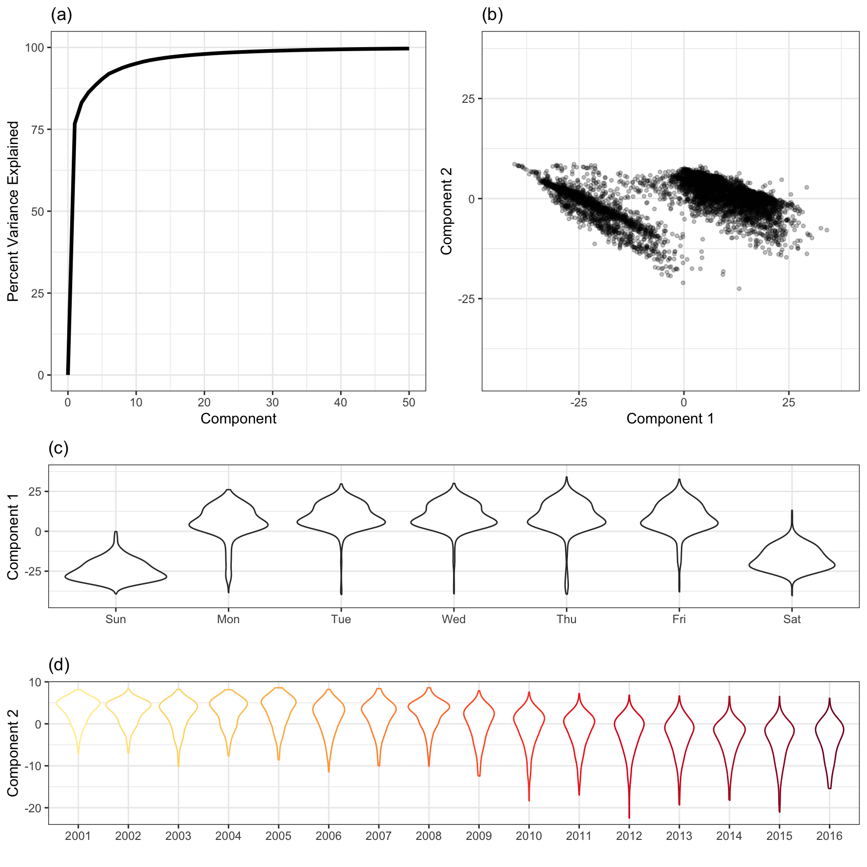 Figure 4.13 provides a summary of the analysis. Part (a) displays the cumulative amount of variation summarized across the first 50 components. This type of plot is used to visually determine how many components are required to summarize a sufficient amount of variation in the data. Examining a scatter plot of the first two components (b) reveals that PCA is focusing on variation due to the part of the week with the weekday samples with lower component 1 scores and weekend samples with higher component 1 scores. The second component focuses on variation due to change over time with earlier samples receiving lower component 2 scores and later samples receiving higher component 2 scores. These patterns are revealed more clearly in parts (c) and (d) where the first and second component are plotted against the underlying variables that appear to affect them the most.