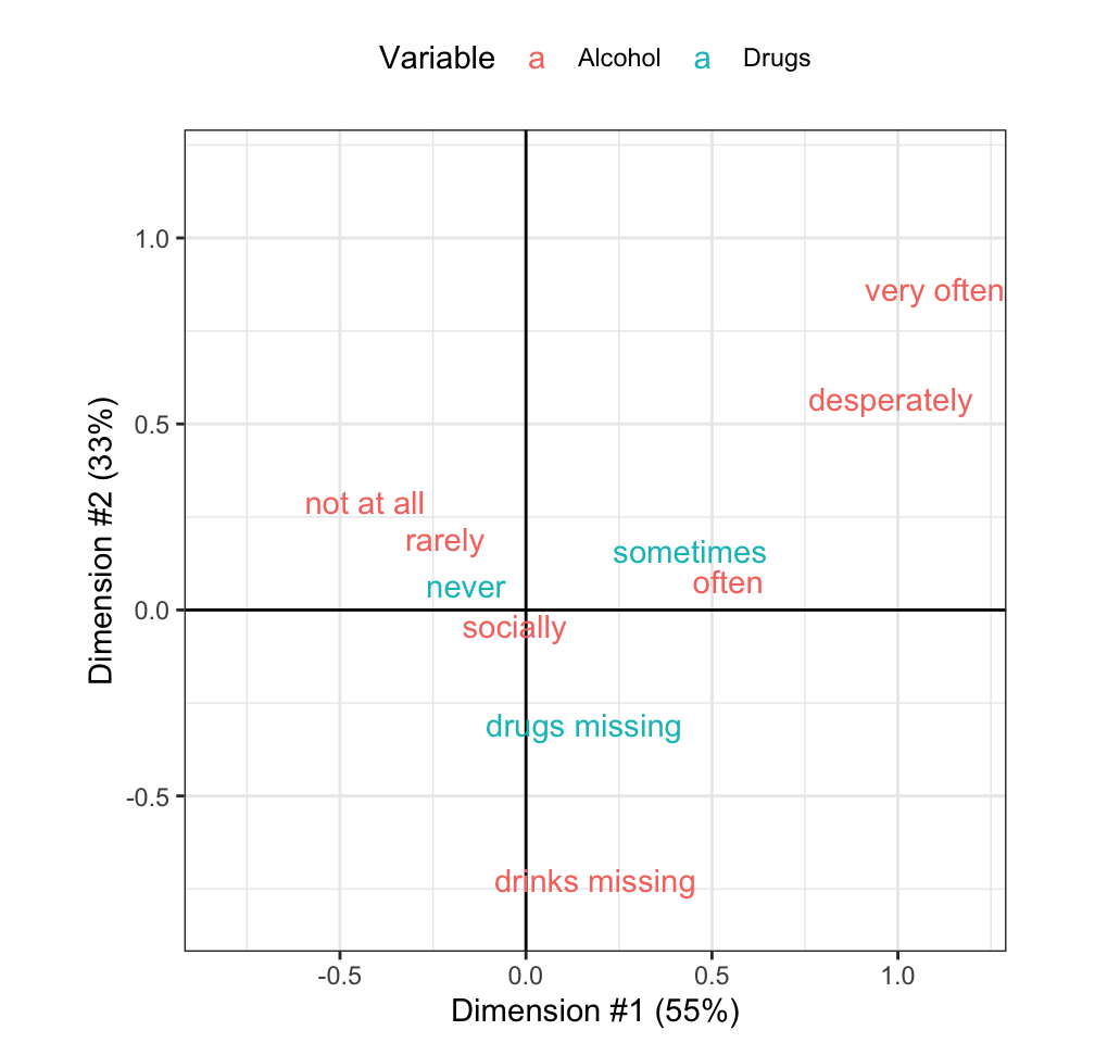 Figure 4.17 shows the principal coordinates from the correspondence analysis. The component on the x-axis accounts for more than half of the \(\chi^2\) statistics. The values around zero in this dimension tends to indicate that no choice was made or sporadic substance use. To the right, away from zero, are less frequently occurring values. A small cluster indicates that occasional drug use and frequent drinking tend to have a specific association in the data. Another, more extreme, cluster shows that using alcohol very often and drugs have an association. The y-axis of the plot is mostly driven by the missing data (understandably since 25.8% of the table has at least one missing response) and accounts for another third of the \(\chi^2\) statistics. These results indicate that these two variables have similar results and might be measuring the same underlying characteristic.