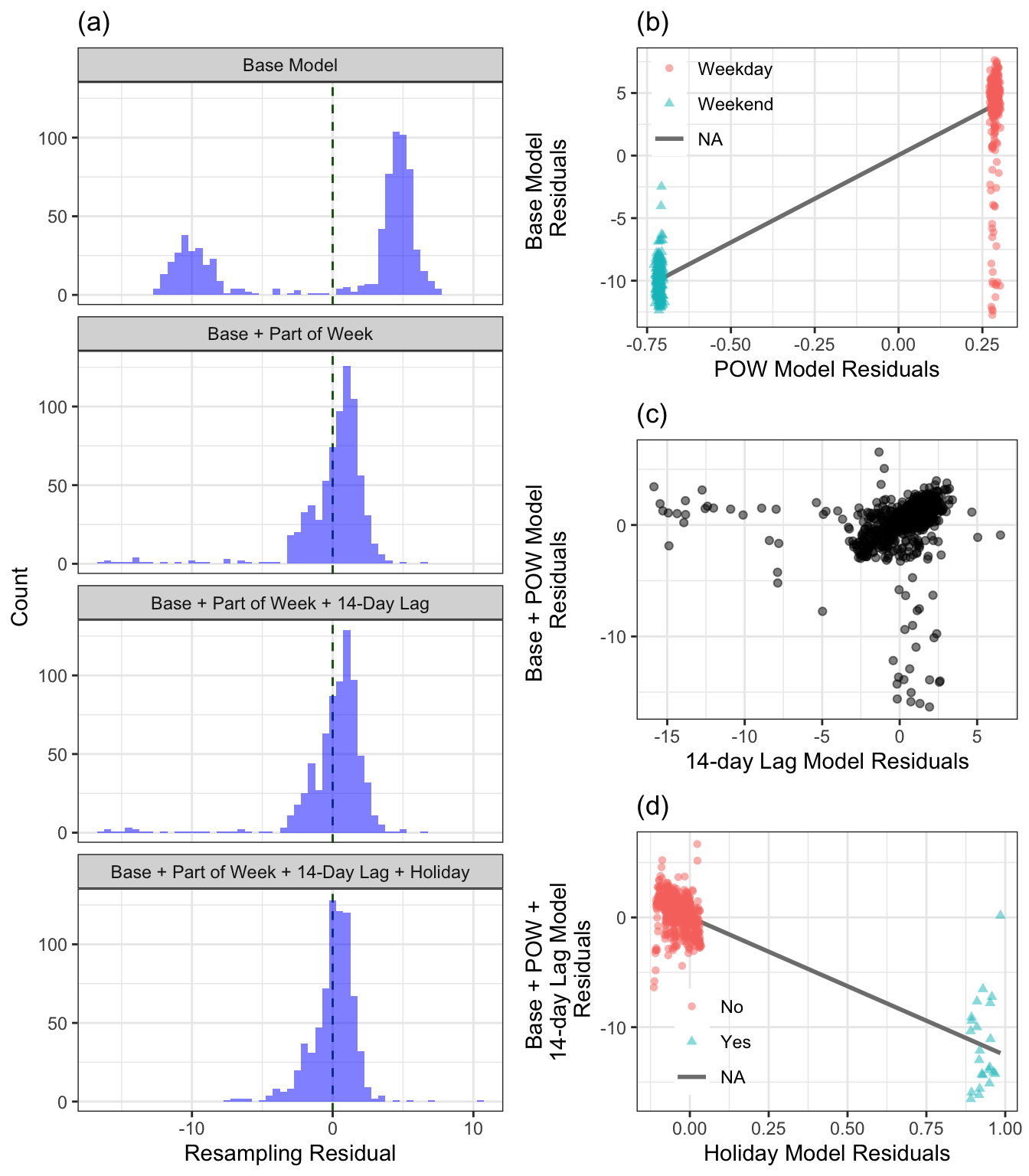 The response for the regression model is the ridership at the Clark/Lake station, and our initial model will contain the predictors of week, month and year. The distribution of the hold-out residuals from this model are provided in Figure 4.19(a). As we saw earlier in this chapter, the distribution has two peaks, which we found were due to the part of the week (weekday versus weekend). To investigate the importance of part of the week we then regress the base predictors on part of the week and compute the hold-out residuals from this model. The relationship between sets of hold-out residuals is provided in (b) which demonstrates the non-random relationship, indicating that part of the week contains additional predictive information for the Clark/Lake station ridership. We can see that including part of the week in the model further reduces the residual distribution as illustrated in the histogram labeled Base + Part of Week.