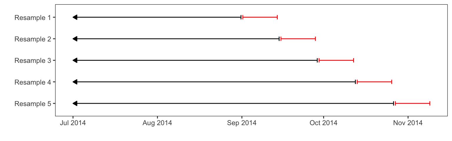 For the Chicago data, a rolling forecast origin scheme (Section 3.4.4) was used for resampling. There are 5698 data points in the training set, each representing a single day. The resampling used here contains a base set of samples before September 01, 2014 and the analysis/assessment splits begins at this date. In doing this, the analysis set grows cumulatively; once an assessment set is evaluated, it is put into the analysis set on the next iteration of resampling. Each assessment set contains the 14 days immediately after the last value in the analysis set. As a result, there are 52 resamples and each assessment set is a mutually exclusive collection of the latest dates. This scheme is meant to mimic how the data would be repeatedly analyzed; once a new set of data are captured, the previous set is used to train the model and the new data are used as a test set. Figure 4.18 shows an illustration of the first few resamples. The arrows on the left-hand side indicate that the full analysis set starts on January 22, 2001.