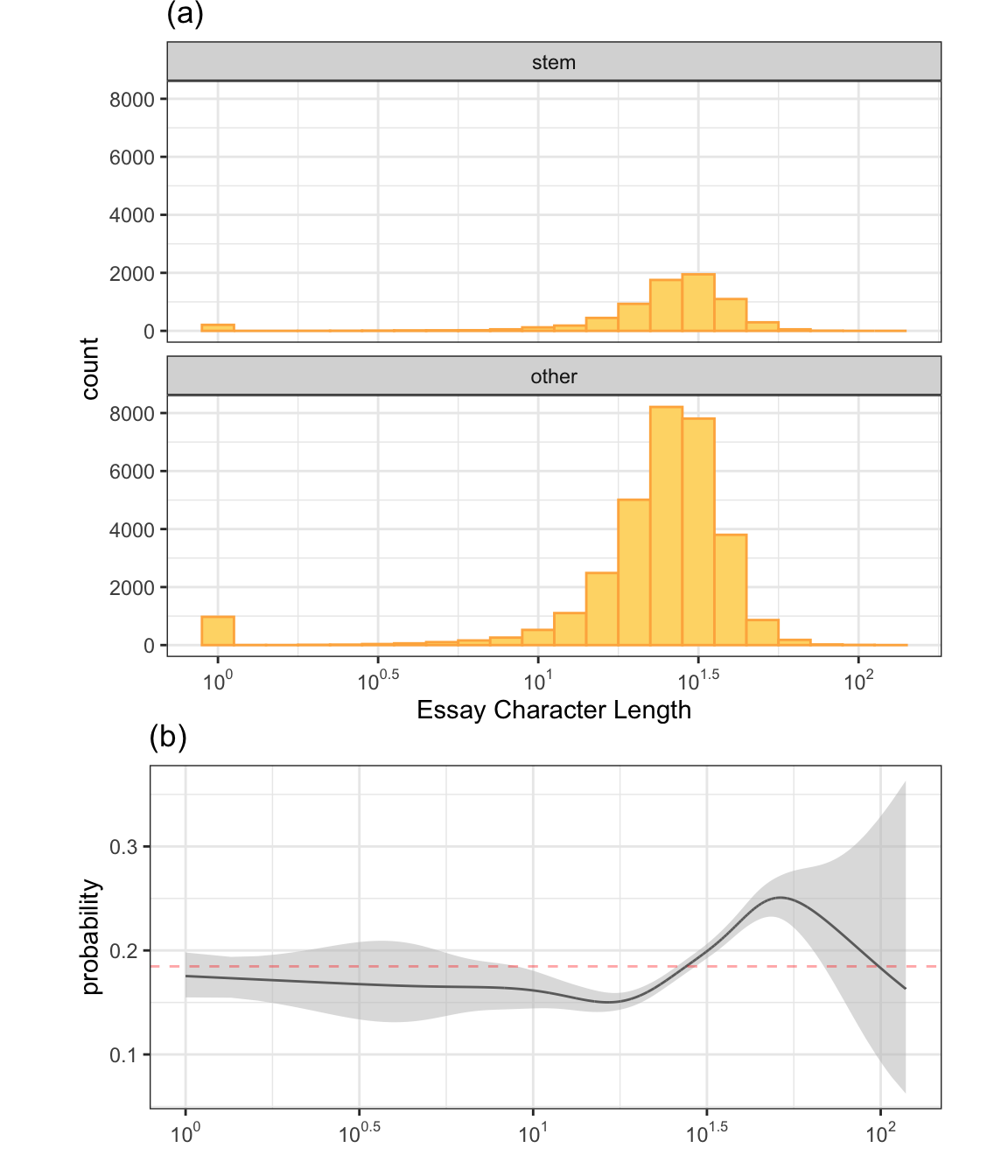 The results are shown in Figure 4.15(b). The black line represents the class probability of the logistic regression model and the bands denote 95% confidence intervals around the fit. The horizontal red line indicates the baseline probability of STEM profiles from the training set. Prior to a length of about \(10^{1.5}\), the profile is slightly less likely than chance to be STEM. Larger profiles show and increase in the probability. This might seem like a worthwhile predictor but consider the scale of the y-axis. If this were put in the full probability scale of [0, 1], the trend would appear virtually flat. At most, the increase in the likelihood of being a STEM profile is almost 3.5%. Also, note that the confidence bands rapidly expand around \(10^{1.75}\) mostly due to a decreasing number of data points in this range so the potential increase in probability has a high degree of uncertainty. This predictor might be worth including in a model but is unlikely to show a strong effect on its own.