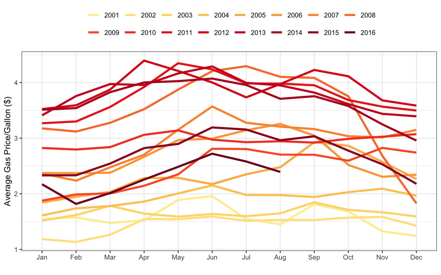 Weekend ridership also shows annual trends but exhibits more variation within the trends for some years. Uncovering predictors associated with this increased variation could help reduce forecasting error. Specifically, the Weekend line plots have the highest variation during 2008, with much higher ridership in the summer. A potential driver for increased ridership on public transportation is gasoline prices. Weekly gas prices in the Chicago area were collected from the U.S. Energy Information Administration, and the monthly average price by year is shown in the line plot of Figure 4.11.