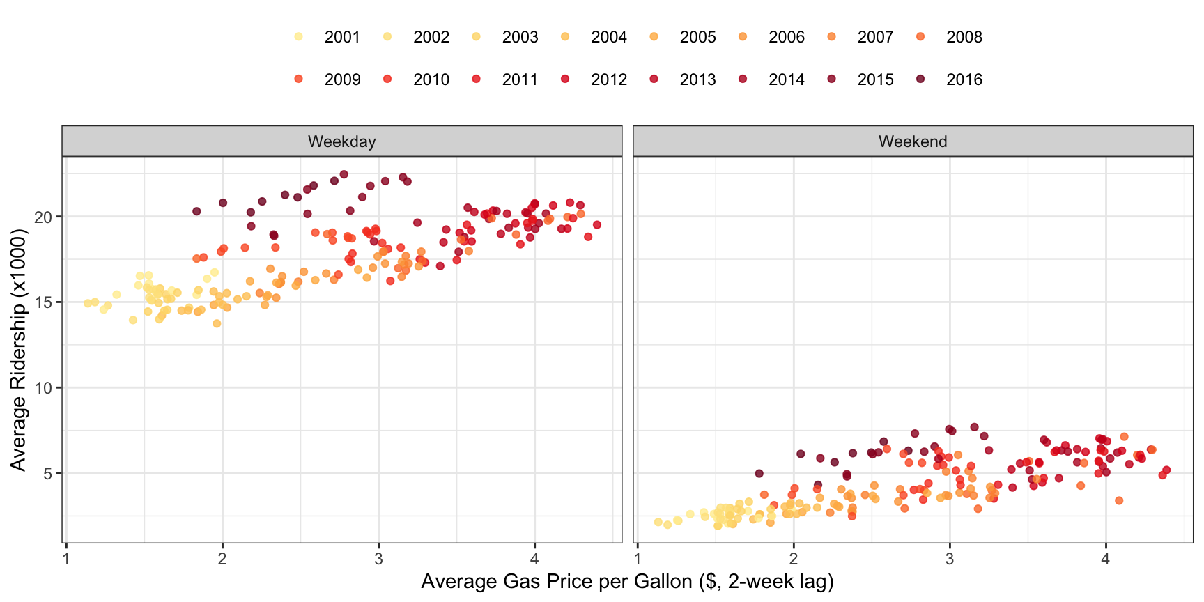Next, let’s see if a relationship can be established between gas prices and ridership. To do this, we will calculate the monthly average 2-week lag in gas price and the geometric mean of ridership at the Clark/Lake station. Figure 4.12 illustrates this relationship; there is a positive association between the 2-week lag in gas price and the geometric mean of ridership. From 2001 through 2014, the higher the gas price, the higher the ridership, with 2008 data appearing at the far right of both the Weekday and Weekend scatter plots. This trend is slightly different for 2015 and 2016 when oil prices dropped due to a marked increase in supply (U.S. Energy Information Administration 2017b). Here we see that by digging in to characteristics of the original line plot, another feature can be found that will be useful for explaining some of the variation in ridership.