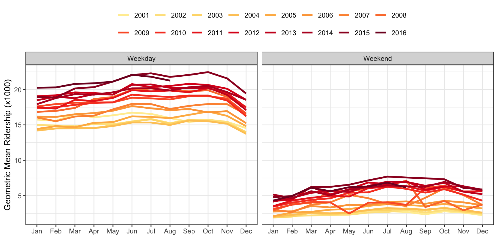 The Chicago data are collected over time, so we should also look for potential trends due to time. To look for these trends, the mean of ridership per month during weekdays and separately during the weekend was computed (Figure 4.10). Here we see that since 2001, ridership has steadily increased during weekdays and weekends. This would make sense because the population of the Chicago metropolitan area has increased during this time period (United States Census Bureau 2017). The line plot additionally reveals that within each year ridership generally increases from January through October then decreases through December. These findings imply that the time proximity of ridership information should be useful to a model. That is, understanding ridership information within the last week or month will be more useful in predicting future ridership.