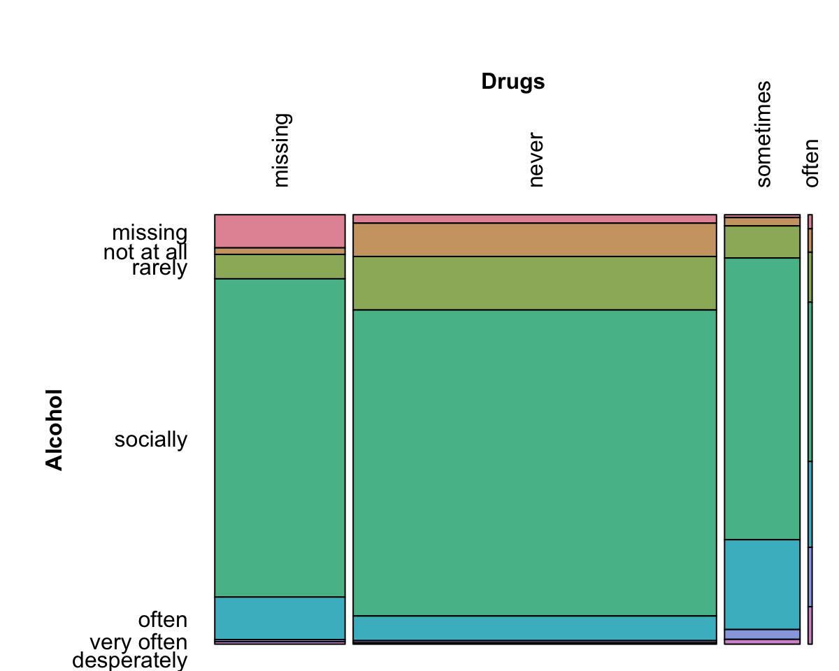 Before deciding how to use predictors that contain non-numeric data, it is critical to understand their characteristics and relationships with other predictors. The unfortunate practice that is often seen relies on a large number of basic statistical analyses of two-way tables that boil relationships down to numerical summaries such as the Chi-squared (\(\chi^2\)) test of association. Often the best approach is to visualize the data. When considering relationships between categorical data, there are several options. Once a cross-tabulation between variables is created, mosaic plots can once again be used to understand the relationship between variables. For the OkCupid data, it is conceivable that the questionnaires for drug and alcohol use might be related and, for these variables, Figure 4.16 shows the mosaic plot. For alcohol, the majority of the data indicate social drinking while the vast majority of the drug responses were “never” or missing. Is there any relationship between these variables? Do any of the responses “cluster” with others?