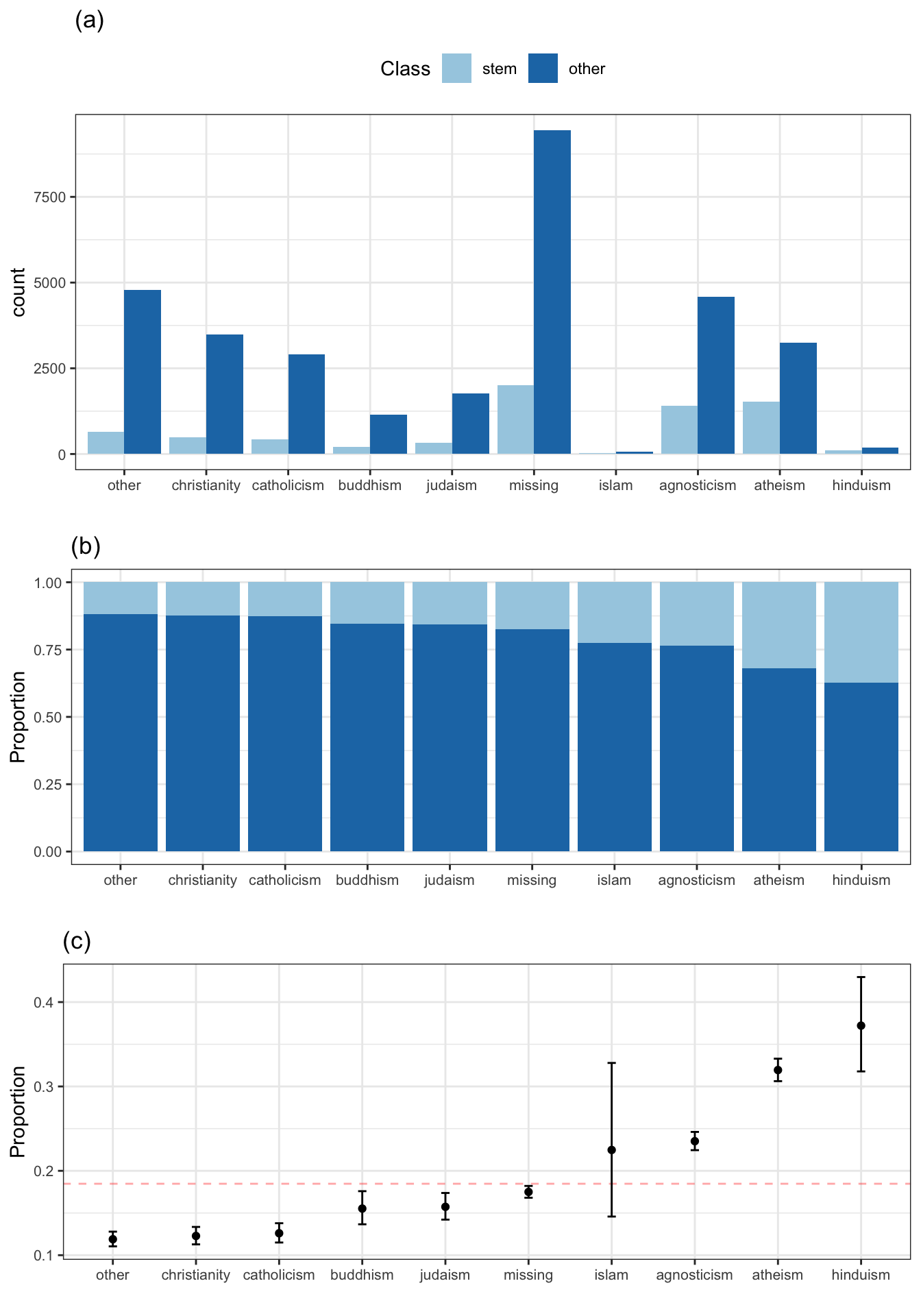 To solve the first two issues, we might show the within-religion percentages of the STEM profiles. Figure 4.14(b) shows this alternative version of the bar chart, which is an improvement since the proportion of STEM profiles is now the focus. It is more obvious how the religions were ordered and we can see how much each deviates from the baseline rate of 18.4%. However, we still haven’t illustrated the uncertainty. Therefore, we cannot assess if the rates for the profiles with no stated religion are truly different from agnostics. Also, while Figure 4.14(b) directly compares proportions across religions, it does not give any sense of the frequency of each religion. For these data there are very few Islamic profiles; this important information cannot be seen in this display.
