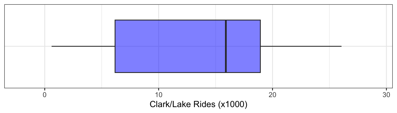 Because the foremost goal of modeling is to understand variation in the response, the first step should be to understand the distribution of the response. For a continuous response such as the ridership at the Clark/Lake station, it is important to understand if the response has a symmetric distribution, if the distribution has a decreasing frequency of larger observations (i.e., the distribution is skewed), if the distribution appears to be made up of two or more individual distributions (i.e., the distribution has multiple peaks or modes), or if there appears to be unusually low or high observations (i.e outliers).