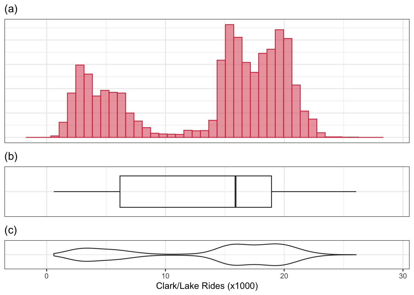 A drawback of the box plot is that it is not effective at identifying distributions that have multiple peaks or modes. As an example, consider the distribution of ridership at the Clark/Lake station (Figure 4.3). Part (a) of this figure is a histogram of the data. To create a histogram, the data are binned into equal regions of the variable’s value. The number of samples are counted in each region, and a bar is created with the height of the frequency (or percentage) of samples in that region. Like box plots, histograms are simple to create, and these figures offer the ability to see additional distributional characteristics. In the ridership distribution, there are two peaks, which could represent two different mechanisms that affect ridership. The box plot (b) is unable to capture this important nuance. To achieve a compact visualization of the distribution that retains histogram-like characteristics, Hintze and Nelson (1998) developed the violin plot. This plot is created by generating a density or distribution of the data and its mirror image. Figure 4.3 (c) is the violin plot, where we can now see the two distinct peaks in ridership distribution. The lower quartile, median, and upper quartile can be added to a violin plot to also consider this information in the overall assessment of the distribution.