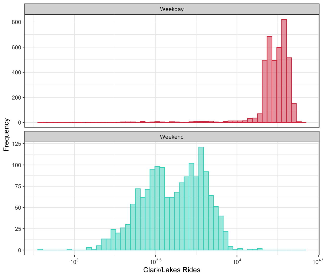 Additional dimensions can be added to almost any figure by using faceting, colors, and shapes. Faceting refers to creating the same type of plot (e.g., a scatter plot) and splitting the plot into different panels based on some variable4. Figure 3.2 is a good example. While this is a simple approach, these types of augmentation can be powerful tools for seeing important patterns that can be used to direct the engineering of new features. The Clark/Lake station ridership distribution is a prime candidate for adding another dimension. As shown above, Figure 4.3 has two distinct peaks. A reasonable explanation for this would be that ridership is different for weekdays than for weekends. Figure 4.5 partitions the ridership distribution by part of the week through color and faceting (for ease of visualization). Part of the week was not a predictor in the original data set; by using intuition and carefully examining the distribution, we have found a feature that is important and necessary for explaining ridership and should be included in a model.