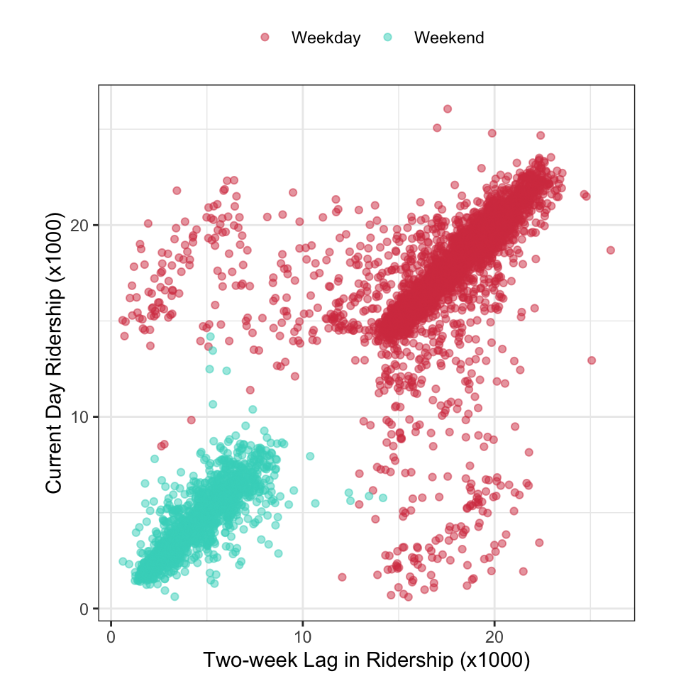 In this case, the relationship between these variables can be directly understood by creating a scatter plot (Figure 4.6). This figure highlights several characteristics that we need to know: there is a strong linear relationship between the 14-day lag and current-day ridership, there are two distinct groups of points (due to the part of the week), and there are many 14-day lag/current day pairs of days that lie far off from the overall scatter of points. These results indicate that the 14-day lag will be a crucial predictor for explaining current-day ridership. Moreover, uncovering the explanation of samples that are far off from the overall pattern visualized here will lead to a new feature that will be useful as a input to models.