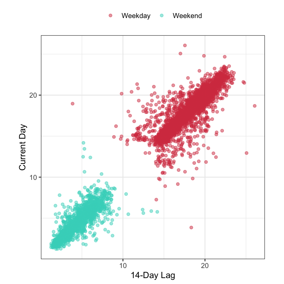 If the goal is to predict ridership at the Clark/Lake station then we could anticipate that recent past ridership information should be related to current ridership. That is to say another potential predictor to consider would be the previous day’s or previous week’s ridership information. Because we know that weekday and weekend have different distributions, a one-day lag would be less useful for predicting ridership on Monday or Saturday. A week-based lag would not have this difficulty (although it would be further apart in time) since the information occurs on the same day of the week. Because the primary interest is in predicting ridership two weeks in advance, we will create the 14-day lag in ridership for the Clark/Lake station.