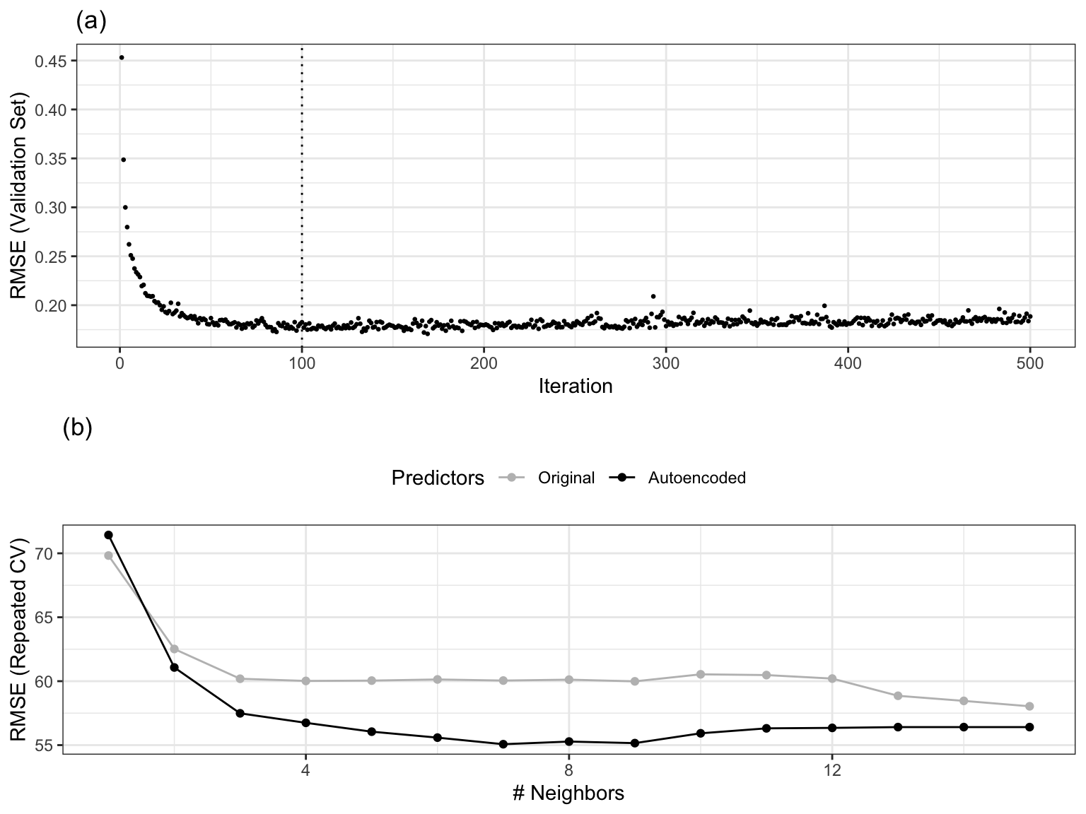 An autoencoder with two hidden layers, each with 512 units, was used to model the predictors. A hyperbolic tangent activation function was used to go between the original units and the first set of hidden units, as well as between the two hidden layers, and a linear function connected the second set of hidden units and the 76 output features. The total number of model parameters was 341,068. The RMSE on a random 20% validation set of the unlabeled data was used to measure performance as the model was being trained. The model was trained across 500 iterations and Figure 6.15(a) shows that the RMSE drastically decreases in the first 50 iterations, is minimized around 100 iterations, then slowly increases over the remaining iterations. The autoencoder model, based on the coefficients from the 100th iteration, was applied to the training and test set.
