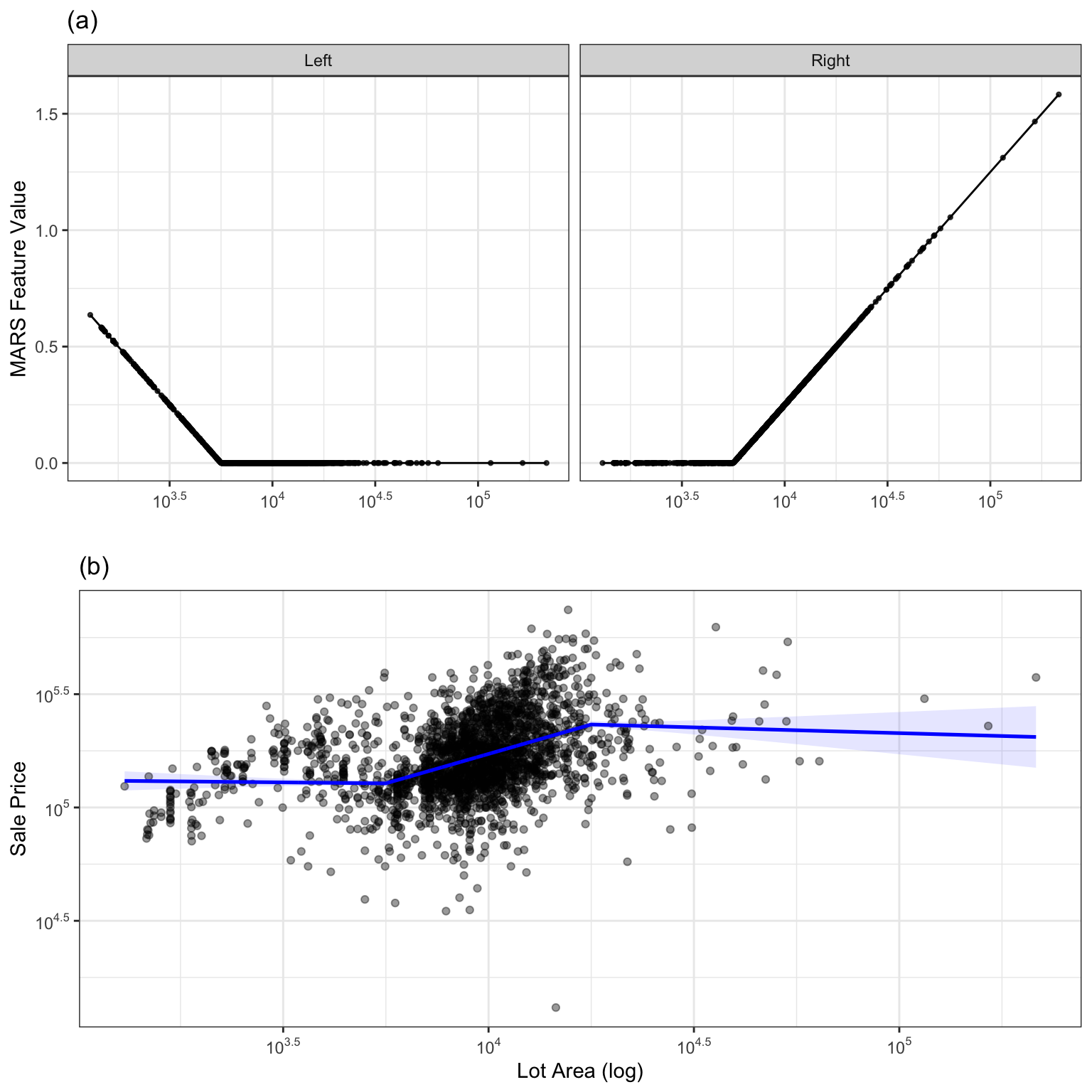 These features can be added to models to create segmented regression models that have distinct sections with different trends. As previously mentioned, the lot area data in Figure 6.4 exhibits a linear trend in the central region of the data and flat trends on either extreme. Suppose that two sets of hinge functions were added to a linear model with knots at 3.75 and 4.25. This would generate a separate linear trend in the region below a value of \(10^{3.75}\), between \(10^{3.75}\) and \(10^{4.25}\), and above \(10^{4.25}\). When added to a linear regression, the left-most region’s slope would be driven by the “left-handed” hinge functions for both knots. The middle region would involve the slopes for both terms associated with a knot of \(10^{3.75}\) as well as the left-handed hinge function with the knot at \(10^{4.25}\) and so on4. The model fit associated with this strategy is shown in Figure 6.5(b).
