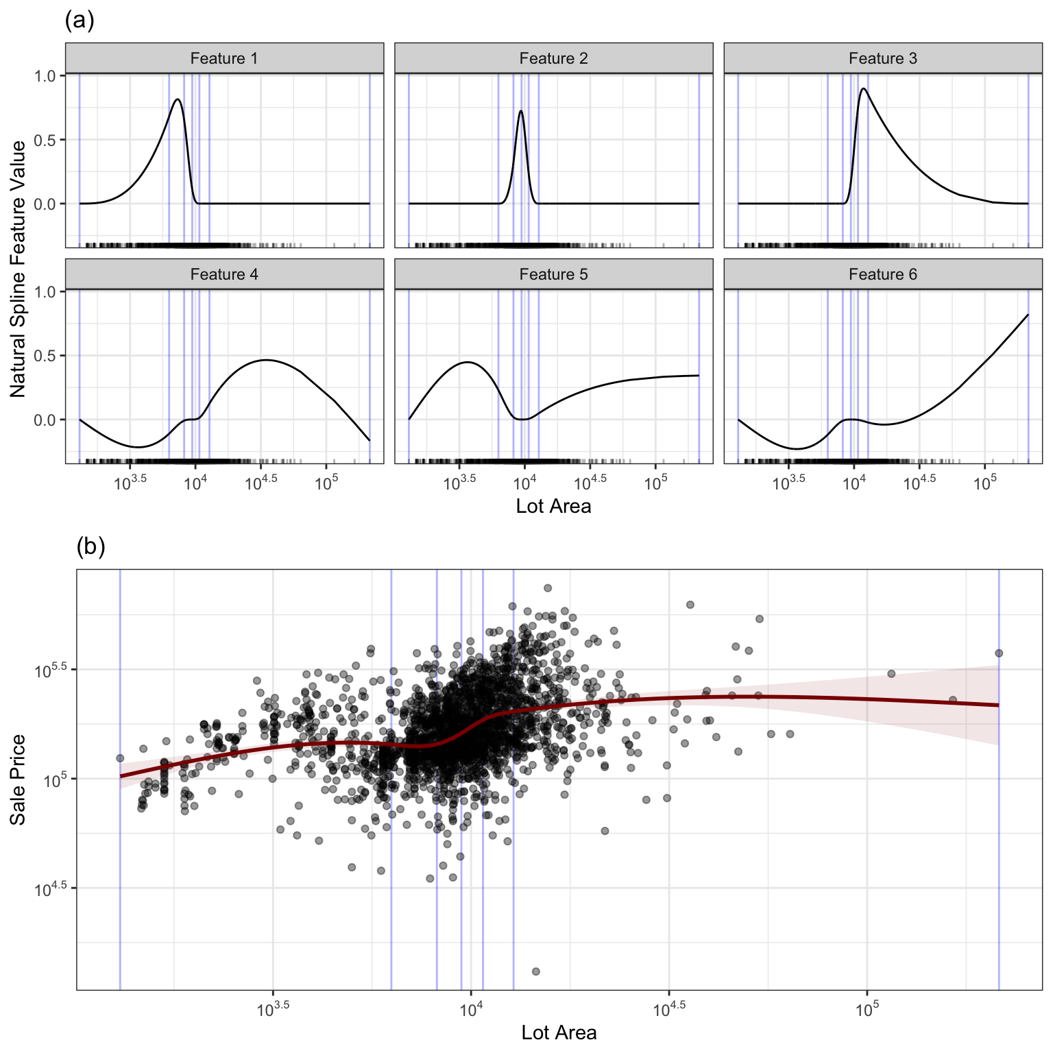 For the Ames lot area data, consider a spline with 6 regions. The procedure places the knots at the following percentiles: . When creating the natural spline basis functions, the first function is typically taken as the intercept. The other functions of \(x\) generated by this procedure are shown in Figure 6.4(a). Here the blue lines indicate the knots. Note that the first three features contain regions where the basis function value is zero. This implies that those features do not affect that part of the predictor space. The other three features appear to put the most weight on areas outside the mainstream of the data. Panel (b) of this figure shows the final regression form. There is a strong linear trend in the middle of the cloud of points and weak relationships outside of the mainstream. The left-hand side does not appear to fit the data especially well. This might imply that more knots are required.