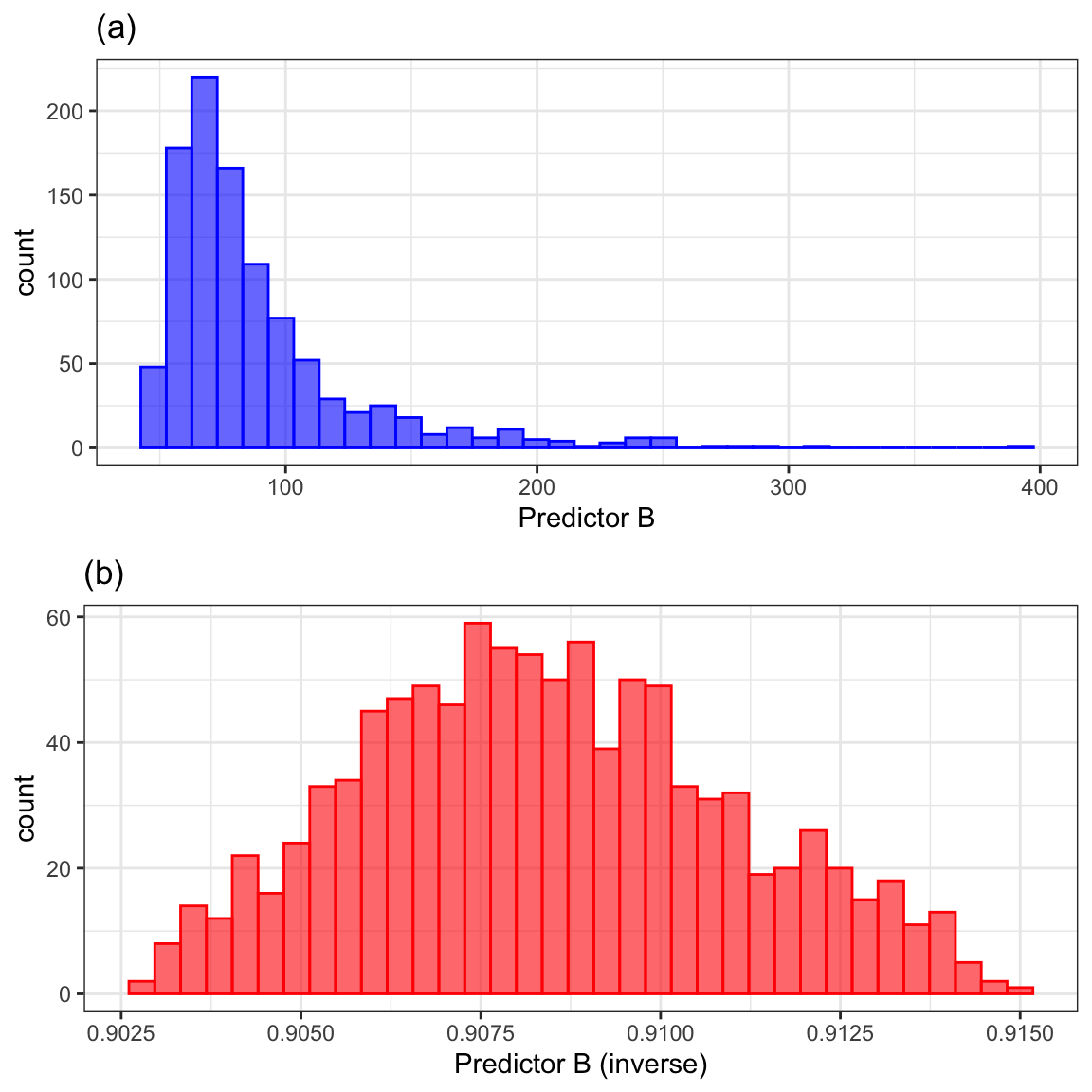 There are a variety of modifications that can be made to an individual predictor that might improve its utility in a model. The first type of transformations to a single predictor discussed here are those that change the scale of the data. A good example is the transformation described in Figure 1.3 of the first chapter. In that case, the two predictors had very skewed distributions and it was shown that using the inverse of the values improved model performance. Figure 6.1(a) shows the test set distribution for one of the predictors from Figure 1.3.