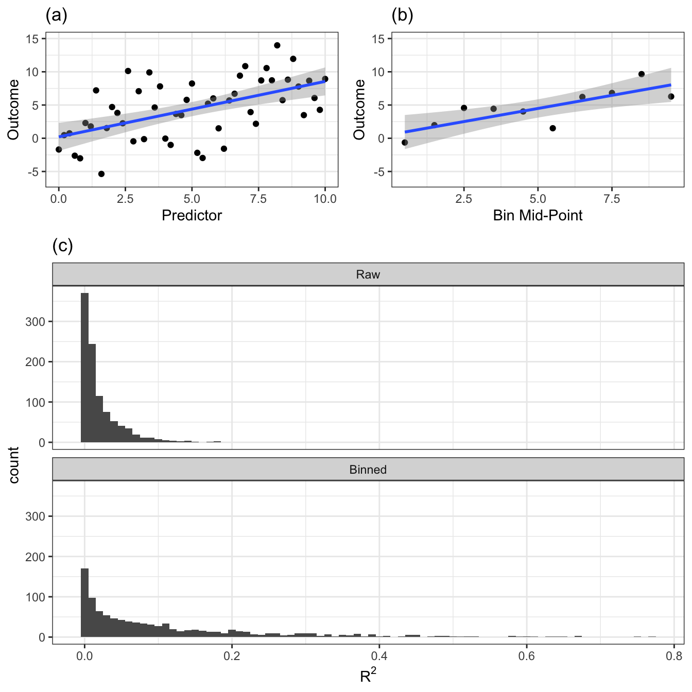Kenny and Montanari (2013) do an exceptional job of illustrating how this can occur and our example follows their research. Suppose a set of variables are being screened to find which have a relationship with a numeric outcome. Figure 6.6(a) shows an example of a simulated data set with a linear trend with a coefficient of 1.0 and normally distributed errors with a standard deviation of 4.0. A linear regression of these data (shown) would find an increasing trend and would have an estimated \(R^2\) of 30.3%. The data were cut into 10 equally spaced bins and the average outcome was estimated per bin These data are shown in panel (b) along with the regression line. Since the average is being used, the estimated \(R^2\) is much larger (64.2%) since the model thinks that the data are more precise (which, in reality, they are not).