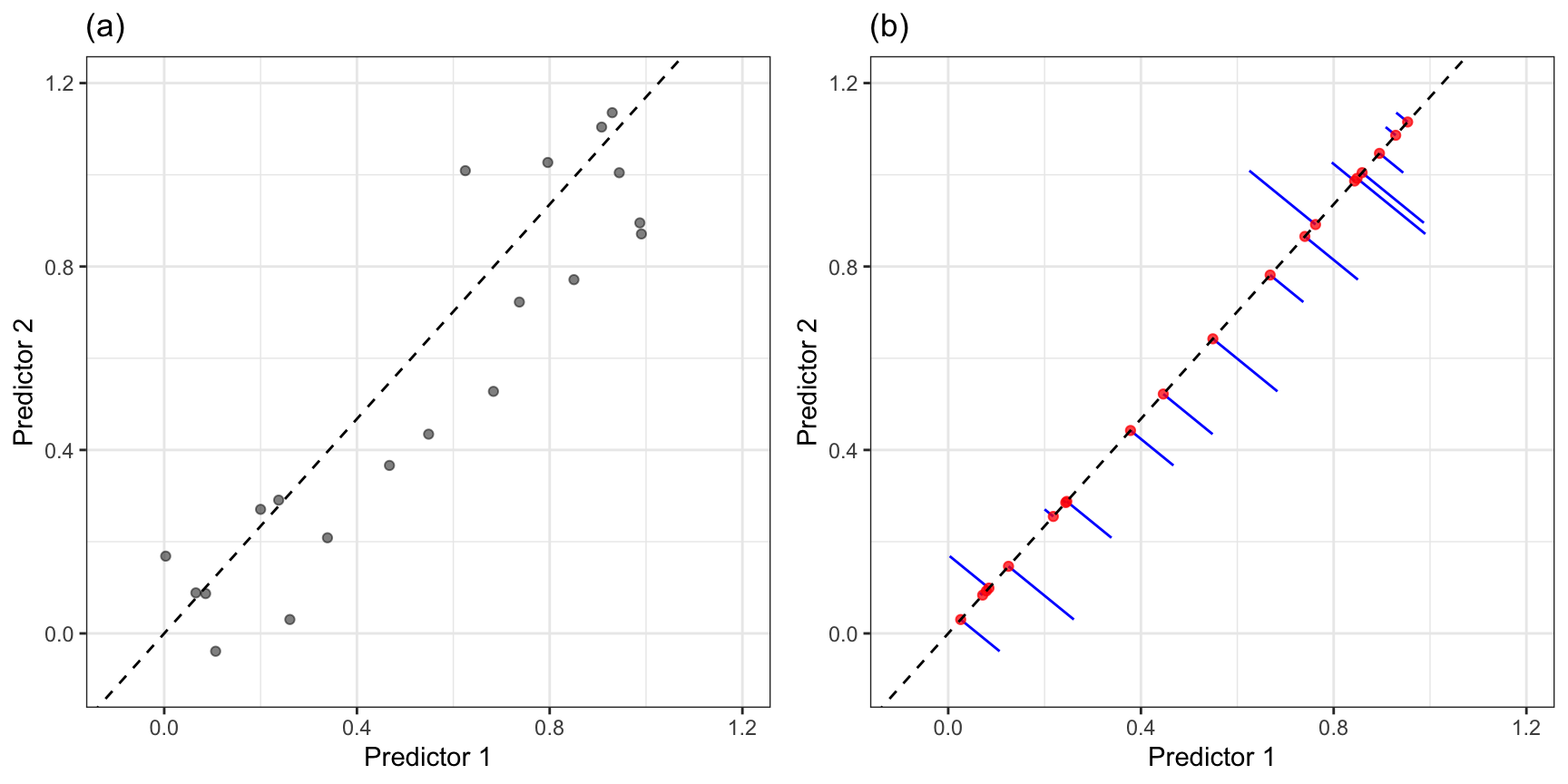 PCA is a particularly useful tool when the available data are composed of one or more clusters of predictors that contain redundant information (e.g., predictors that are highly correlated with one another). Predictors that are highly correlated can be thought of as existing in a lower dimensional space than the original data. As a trivial example, consider the scatter plot in Figure 6.7 (a), where two predictors are linearly related. While these data have been measured in two dimensions, only one dimension is needed (a line) to adequately summarize the position of the samples. That is, these data could be nearly equivalently represented by a combination of these two variables as displayed in part (b) of the figure. The red points in this figure are the orthogonal projections of the original data onto the first principal component score (imagine the diagonal line being rotated to horizontal). The new feature represents the original data by one numeric value which is the distance from the origin to the projected value. After creating the first PCA score, the “leftover” information is represented by the length of the blue lines in panel (b). These distances would be the final score (i.e., the second component).