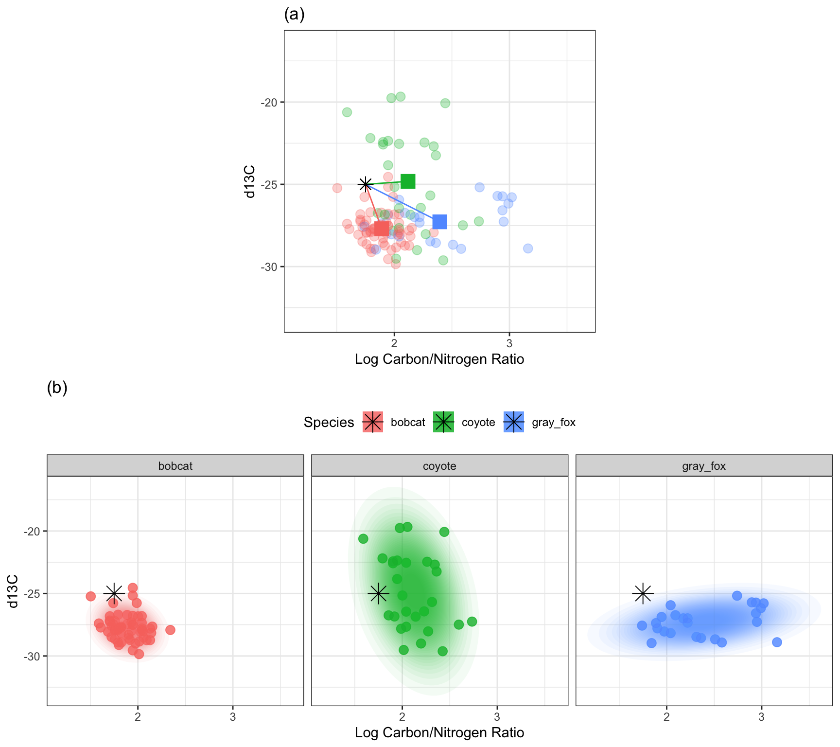 In this case, measuring the depth using the probability distributions provides slightly increase sensitivity than the simple Euclidean distance shown in panel (a). In this case, the new sample being predicted resides inside of the probability zone for coyote more than the other species.
