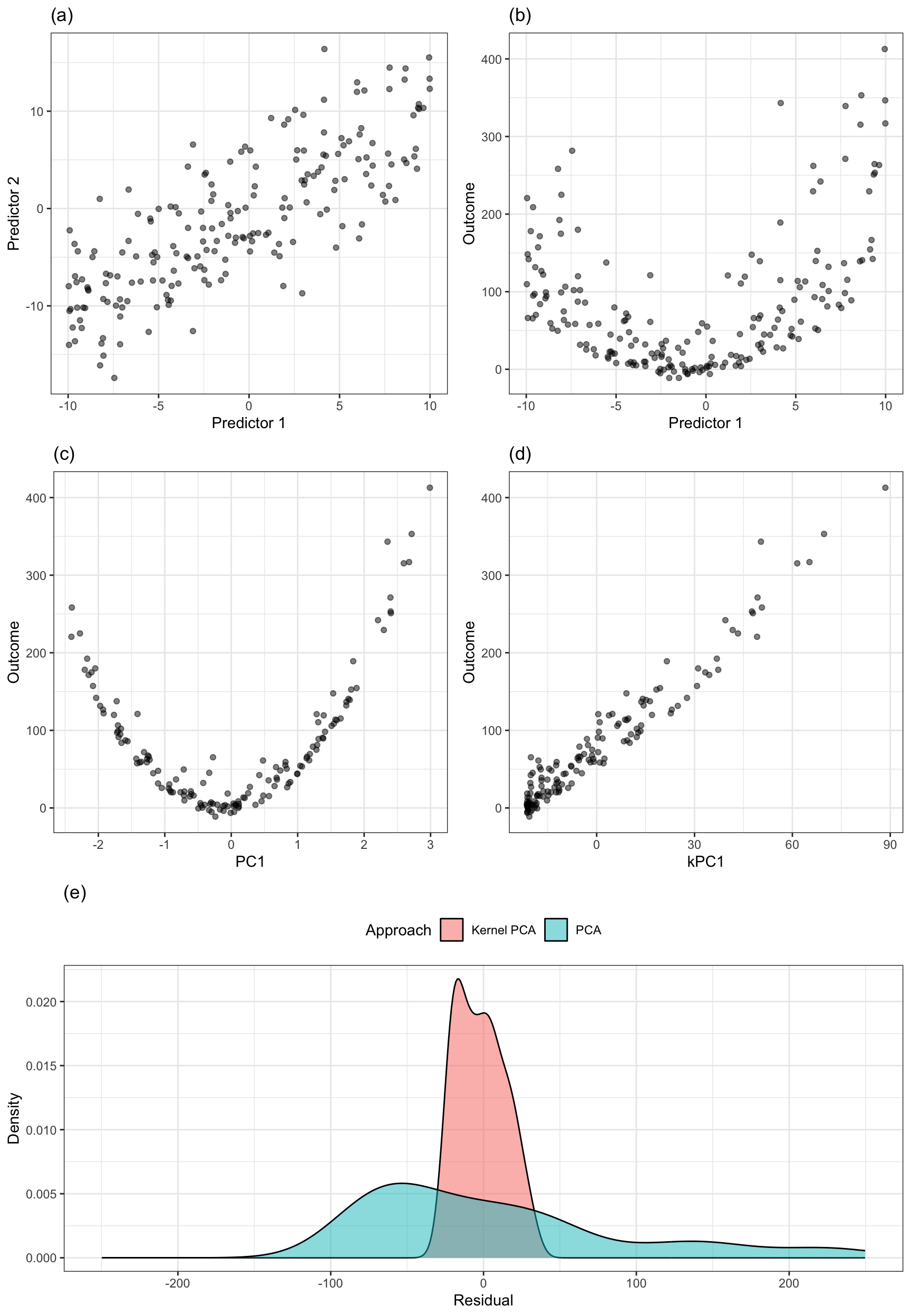 To illustrate the utility of kernel PCA, we will simulate data based on the model earlier in this section. For this simulation, 200 samples were generated, with 150 selected for the training set. PCA and kernel PCA will be used separately as dimension reduction techniques followed by linear regression to compare how these methods perform. Figure 6.12(a) displays the relationship between \(x_1\) and \(x_2\) for the training data. The scatter plot shows the linear relationship between these two predictors. Panel (b) uncovers the quadratic relationship between \(x_1\) and y which could be easily be found and incorporated into a model if there were a small number of predictors. PCA found one dimension to summarize \(x_1\) and \(x_2\) and the relationship between the principal component and the response is presented in Figure 6.12(c). Often in practice, we use the number of components that summarize a threshold amount of variability as the predictors. If we blindly ran principal component regression, we would get a poor fit between \(PC_1\) and \(y\) because these data are better described by a quadratic fit. The relationship between the response and the first component using a polynomial kernel of degree 2 is presented in panel (d). The expansion of the space using this kernel allows PCA to better find the underlying structure among the predictors. Clearly, this structure has a more predictive relationship with the response than the linear method. The model performance on the test is presented in panel (e) where the distirbution of the residuals from the kernel PCA model are demonstrably smaller than those from the PCA model.