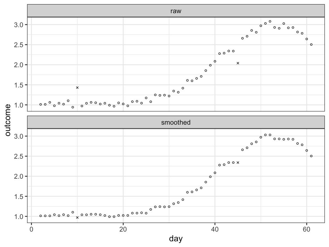 For example, Figure 6.2 shows a sequence of data over 61 days. The raw data are in the top panel and there are two aberrant data values on days 10 and 45. The lower panel shows the results of a 3-point running median smoother. It does not appear to blunt the nonlinear trend seen in the last 15 days of data but does seem to mitigate the outliers. Also, roughly 40% of the smoothed data have the same value as the original sequence.
