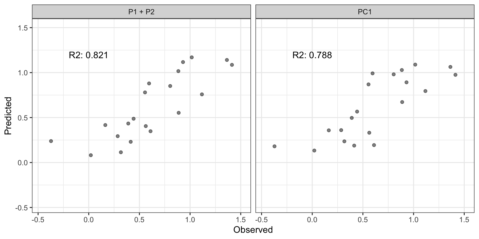 For this simple example, a linear regression model was built using the two correlated predictors. A linear regression model was also built between the first principal component score and the response. Figure 6.8 provides the relationship between the observed and predicted values from each model. For this example, there is virtually no difference in performance between these models.