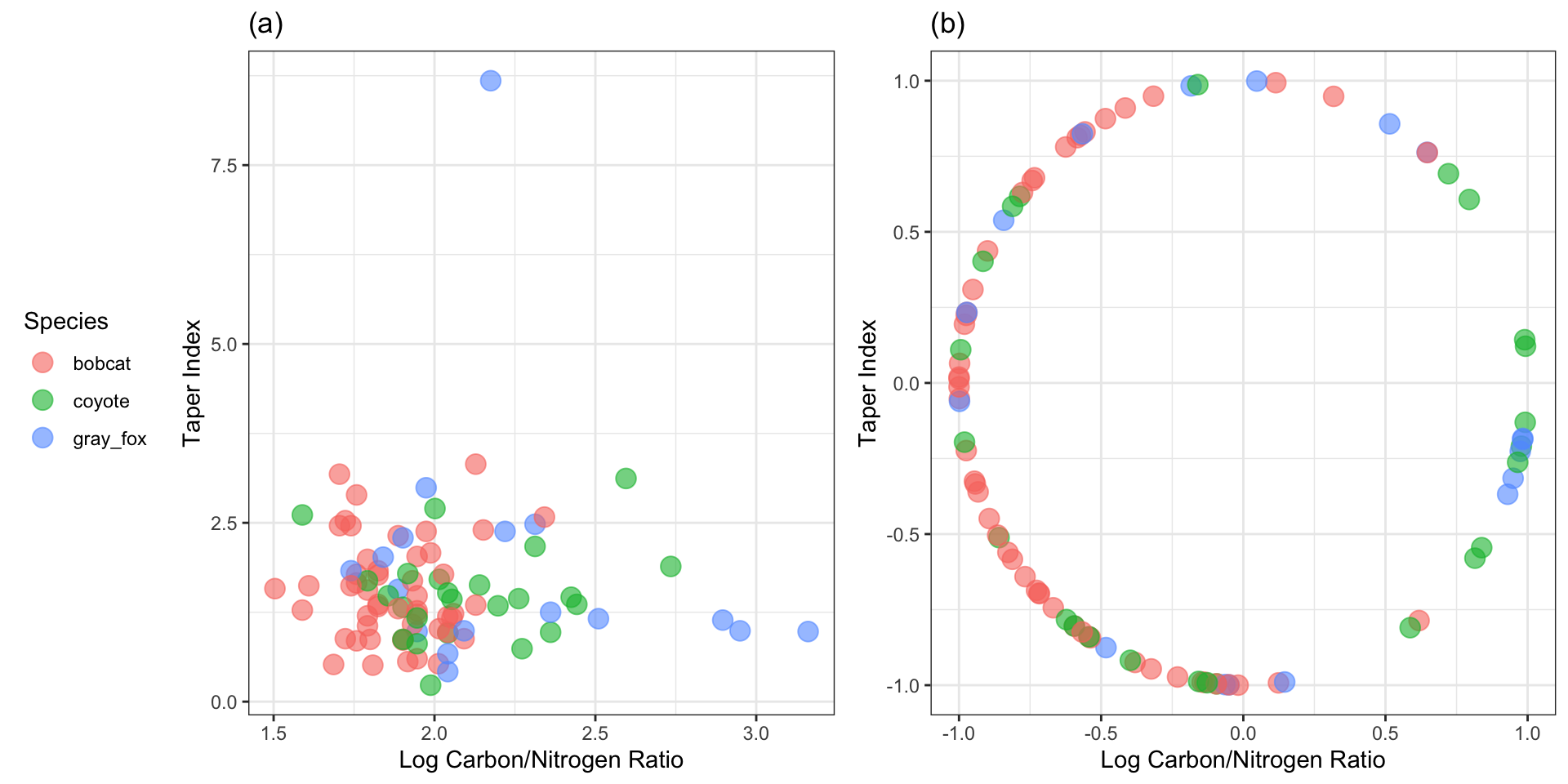 For example, Figure Figure 6.16(a) shows data from Reid (2015) where characteristics of animal scat (i.e., feces) were used to predict the true species of the animal that donated the sample. This figure displays two predictors on the axes, and samples are colored by the true species. The taper index shows a significant outlier on the y-axis. When the transformation is applied to these two predictors, the new values in Figure 6.16(b) show that the data are all equidistant from the center (zero). While the transformed data may appear to be awkward for use in a new model, this transformation can be very effective at mitigating the damage of extreme outliers.