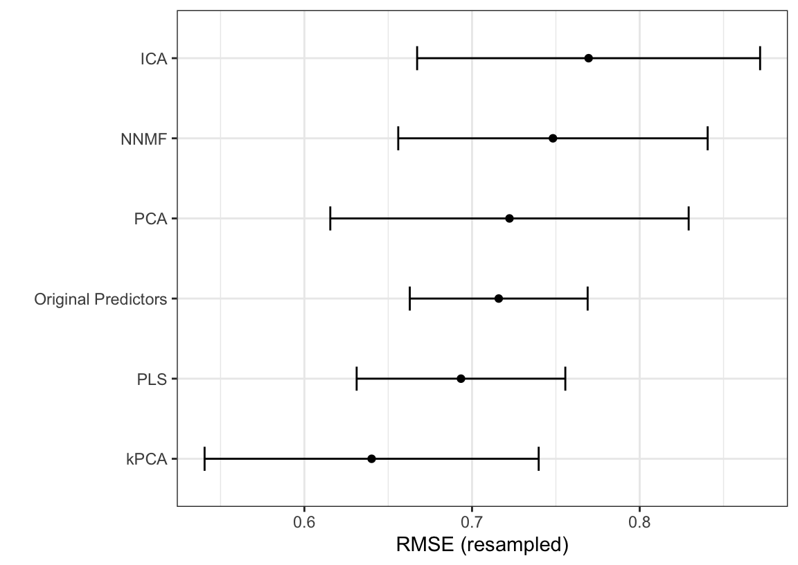 To quantify how well each method was at estimating the relationship between the outcome and the lagged predictors, linear models were fit using each method. In each case, 20 components were computed and entered into a simple linear regression model. To resample, a similar time-based scheme was used where 800 weekends were the initial analysis set and two sets of weekends were used as an assessment set (which are added into analysis set for the next iteration). This led to 25 resamples. Within each resample, the projection methods were recomputed each time and this replication should capture the uncertainty potentially created by those computations. If we had pre-computed the components for the entire training set of weekends, and then resampled, it is very likely that the results would be falsely optimistic. Figure 6.14 shows confidence intervals for the RMSE values over resamples for each method. Although the confidence intervals overlap, there is some indication that PLS and kernel PCA have potential to outperform the original values. For other models that can be very sensitive to between-predictor correlations (e.g., neural networks), these transformation methods could provide materially better performance when they produce features that are uncorrelated.