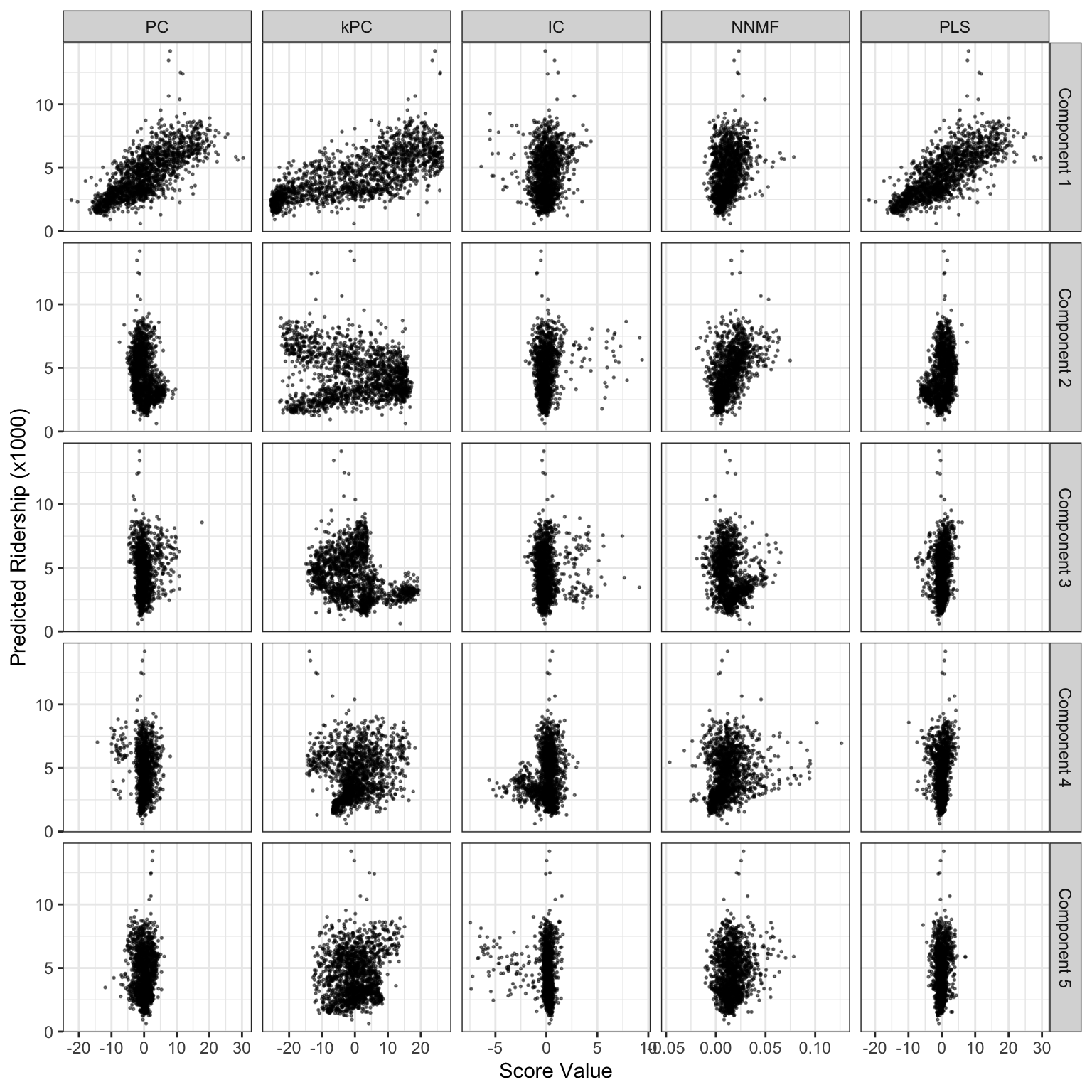 For the Chicago data, a radial basis function kernel was used to get new PCA components. The kernel’s only parameter (\(\sigma\)) was estimated analytically using the method of Caputo et al. (2002); values between 0.00183 and 0.022 seemed reasonable and a value near the middle of the range (0.00589) was used to compute the components. Sensitivity analysis was done to assess if others choices within this range led to appreciably different results, which they did not. The second column from the left in Figure 6.9 shows the results. Similar to ordinary PCA, the first kPCA components has a strong association with ridership. However, the kernel-based component has a larger dynamic range on the x-axis. The other components shown in the figure are somewhat dissimilar from regular PCA. While these scores have less association with the outcome (in isolation), it is very possible that, when the scores are entered into a regression model simultaneously, they have predictive utility.