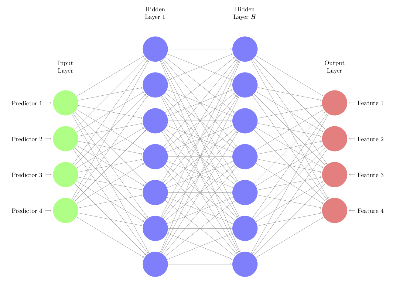 The same philosophy can be used with autoencoders. All of the available predictor data can be used to create an equation that estimates (and potentially smooths) the relationships between the predictors. Based on these patterns, a smaller data set of predictors can be more effectively represented by using their “predicted” feature values.