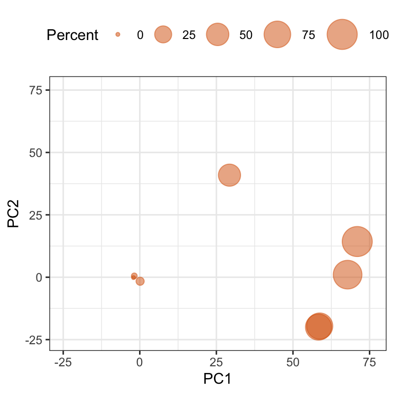 To illustrate this approach, we will return to the Chicago train ridership data which has ridership values for 5,733 days and 146 stations. The missing data matrix can be represented by dates and stations. Applying PCA to this matrix generates the first two components illustrated in Figure 8.3. Points in the plot are sized by the amount of missing stations. In this case each day had at least one station that had a missing value, and there were 8 distinct missing data patterns.