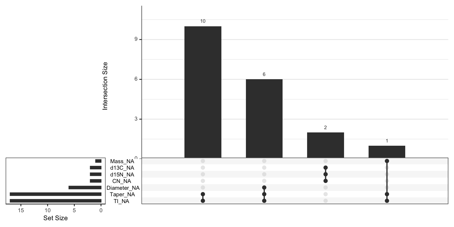 A co-occurrence plot can further deepen the understanding of missing information. This type of plot displays the frequency of missing predictor combinations (Figure 8.1). As the name suggests, a co-occurrence plot displays the frequencies of the most common missing predictor combinations. The figure makes it easy to see that TI, Tapper, and Diameter have the most missing values, that Tapper and TI are missing together most frequently, and that six samples are missing all three of the morphological predictors. The bottom of Figure 8.1 displays the co-occurrence plot for the scat data.