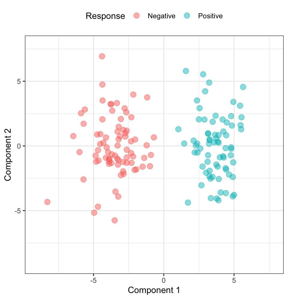 To demonstrate that this selection approach was able to identify predictors that captured the best predictors for classifying the response, the researcher performed principal component analysis on the 300 predictors and plotted the samples projected onto first two components colored by response category. This plot revealed near perfect classification between groups, and the researcher concluded that there was good evidence of predictors that could classify the samples.