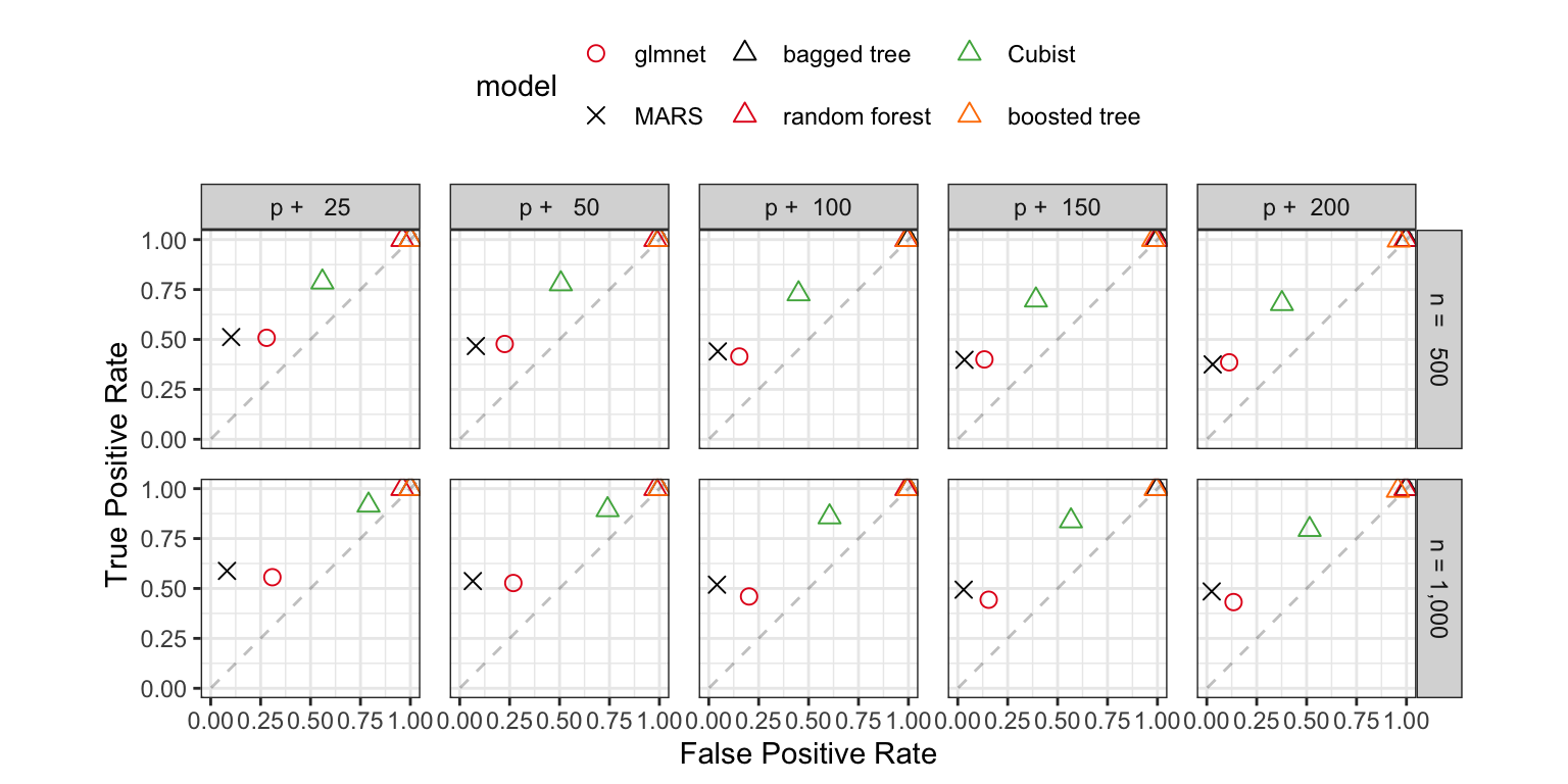 MARS and the glmnet also made trade-offs between sensitivity and specificity in these simulations that tended to favor specificity. These models had false positive rates under 25\(\%\) and true positive rates that were usually between 40\(\%\) and 60\(\%\).