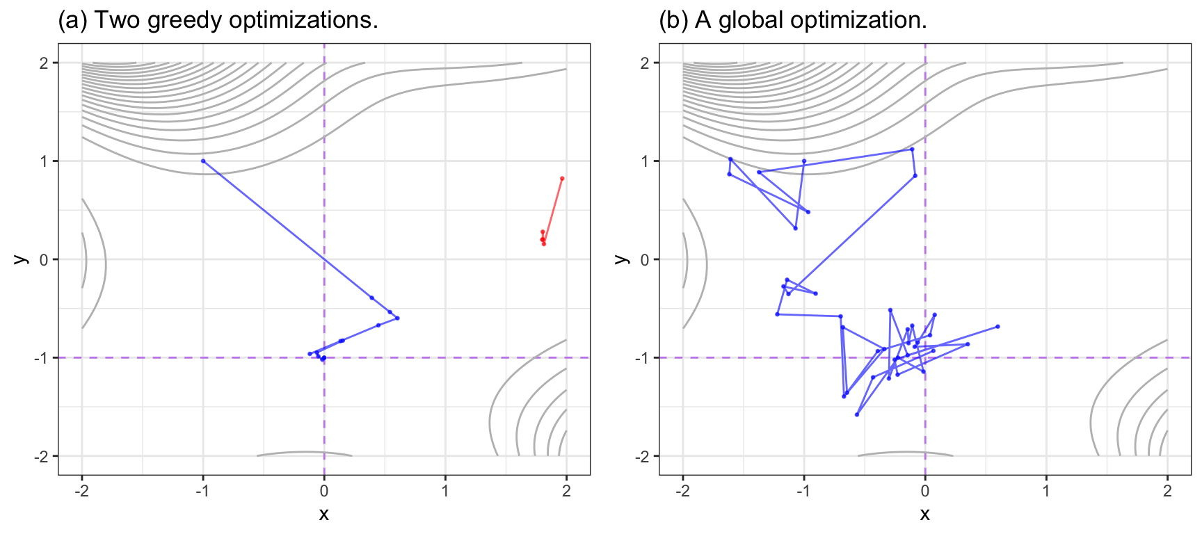 The minimum of this function, where both \(x\) and \(y\) are between -2 and 2, is located at \(x = 0\) and \(y = -1\). The function’s outcome is relatively flat in the middle with large values along the top and lower-right edges. Panel (a) shows the results of two greedy methods that use gradient decent to find the minimum. The first starting value (in red, top right) moves along a path defined by the gradient and stalls at a local minimum. It is unable to re-evaluate the search. The second attempt, starting at \(x = -1\) and \(y = 1\), also follows a different greedy path and, after some course-corrections, finds a solution close to the best value. Each change in the path was to a new direction of immediate benefit. Panel (b) shows a global search methods called simulated annealing. This is a controlled but random approach that will be discussed in greater detail later. It generates a new candidate point using random deviations from the current point. If the new point is better, the process continues. If it is a worse solution, it may accept it with a certain probability. In this way, the global search does not always proceed in the current best direction and tends to explore a broader range of candidate values. In this particular search, a value near the optimum is determined very quickly.